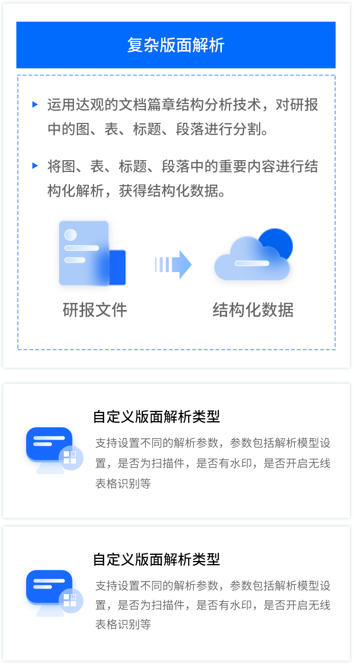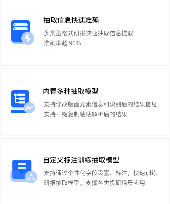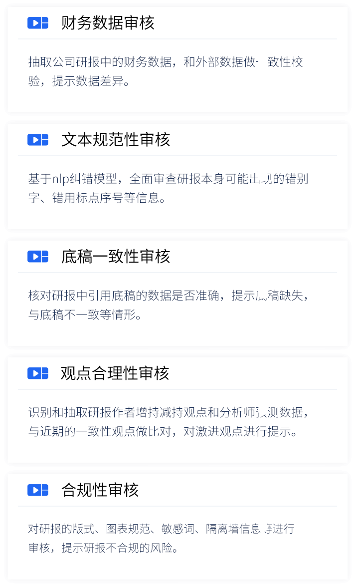 智能研报审核系统是豪门国际数据为券商研究所、买方研究组织等用户打造的集研报解析、抽取、审核、管理功能为一体的产品。集成OCR、NLP、机器学习等技术,对研报和底稿信息进行多方面抽取,并对研报进行数据、文本、观点等全方位的自动化审核, 同时对研报和底稿进行规范化、流程化管理,帮助用户提升工作效率,把控研报发布的时效性和合规性,全面降低出错风险。